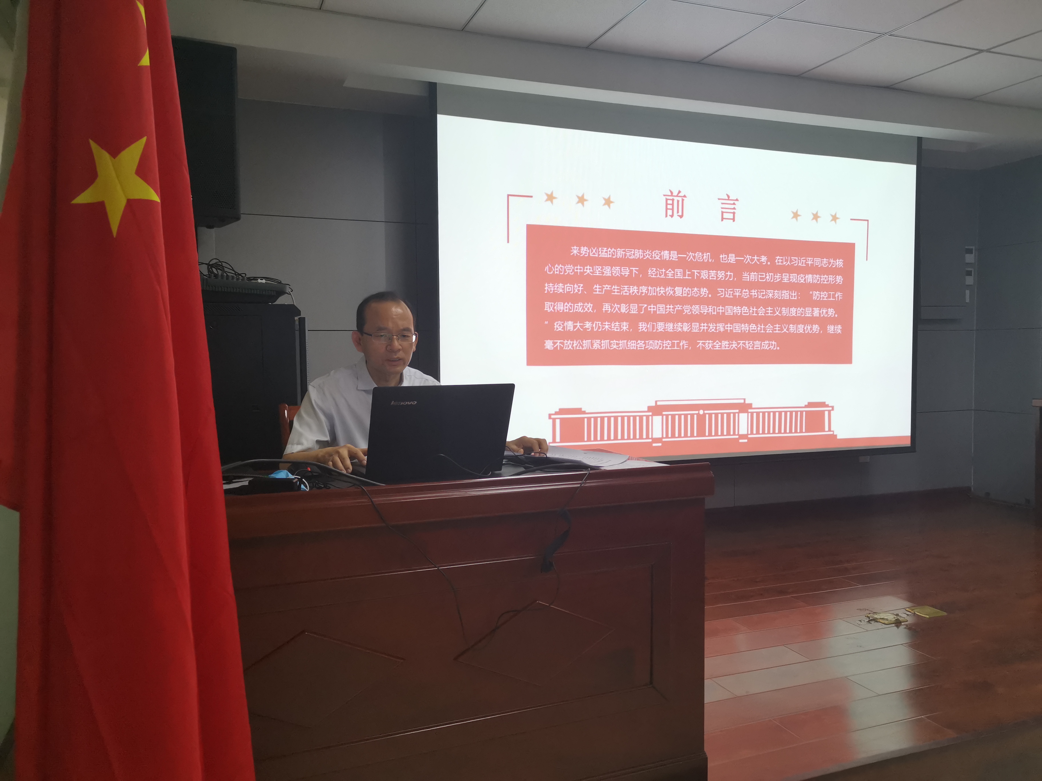 2020年7月2日上午,中共乐投web版登录入口第二支部委员会支部书记焦俊良同志以“在大考中彰显中国特色社会主义制度优势”为题,为全体支部党员和入党积极分子上了一堂别开生面的党课。